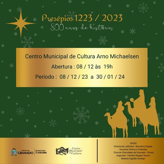 GRAMADO – Na próxima sexta-feira (8), às 19h, acontece a abertura da Exposição “Presépios 1223/2023 – 800 anos de história”, no Centro Municipal de Cultura Arno Michaelsen. A mostra reúne artistas locais, artesãos e colecionadores gramadenses, que irão expor inúmeros presépios em diferentes técnicas.