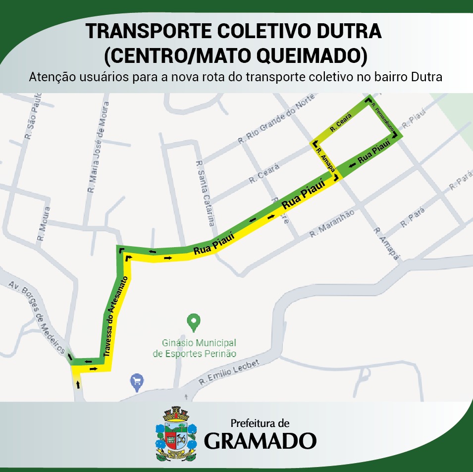 A Prefeitura de Gramado, por meio da Secretaria de Trânsito, informa que o transporte coletivo no bairro Dutra terá uma nova rota a partir deste final de semana, em virtude do bloqueio de algumas vias. No sábado (8) e no domingo (9) o roteiro será testado, passando pelas ruas Travessa do Artesanato, Piauí, Amapá, Ceará e Pernambuco.